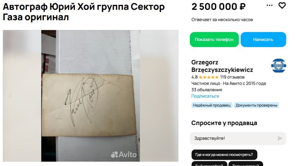 Автограф Юрия Хоя выставлен на продажу в Воронеже за 2,5 миллиона рублей