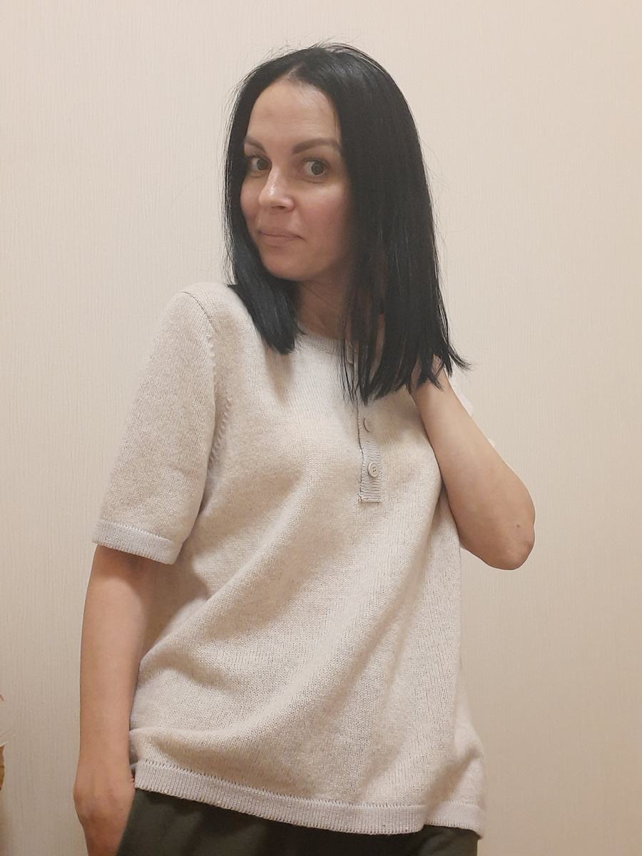 Привет, друзья! Сегодня принесла вам футболку поло из кашемира Coarsehair Loro Piana, но эта пряжа уже в другом метраже 700м/100гр, потоньше, чем использована в предыдущих пуловерах. А на планках, связанных полыми резинками, использована пряжа меринос с серебристыми микро-пайетками, они буквально 1-1,5 мм. Чуточку цвет отличается, но очень гармонично смотрится это сочетание. Плечо у нас японское, рукав втачной. Вес где-то 250гр, точно не подскажу. Цвет пряжи немного меланжевый, очень красивый, обожаю такие оттенки. Заключительное фото. И на этом все, пойду повяжу. До новых встреч! Пока!