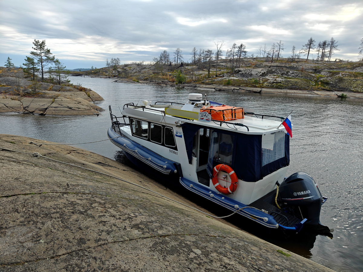 Водные развлечения я не люблю и не планировала эту прогулку. Но это Карелия. Буквально за день до отъезда я поняла, что не могу уехать, не увидев шхеры своими собственными глазами. Между выездом из отеля и поездом у нас было около 8 часов, и я взяла билеты на двухчасовую прогулку на катере. Билеты стоили 2500 на человека. Думала, что, возможно будет льгота для школьников, но нет - только детский билет, 1250 р., от 3 до 10 лет включительно, а наша школьница постарше. Мы отправились с причала в 15:00. Этот день был облачным, но без дождя и местами с просветами солнца. Был отличный свет для красивых фото - светло, но не ослепительно. На Ладоге были волны, но это в моем восприятии, а капитан сказал "штиль". Раз капитан сказал, значит так оно и есть, и даже подпрыгивания катера на волнах не слишком волновало) Вот такой у нас был катер: Там помещается не менее 8 человек, но нас было четверо, только наша семья, случайно получилось. Катер идёт со скоростью 50-53 км/ч, как сказал капитан, и, к