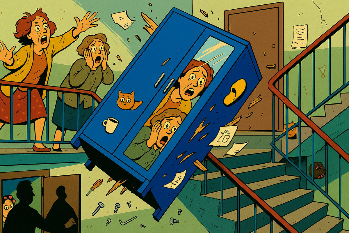 Мой палец, измученный весом ДСП-монстра, соскользнул. Шкаф накренился и начал свое эпическое путешествие вниз по лестнице. Вы когда-нибудь видели, как шкаф превращается в сноуборд? Я — да. Он скользил по ступенькам с грацией пьяного пингвина, оставляя за собой стружку, обрывки картона и мои последние надежды на сохранение репутации в доме.
