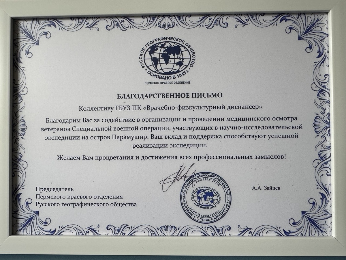 Пермский диспансер получил благодарность от Русского географического общества