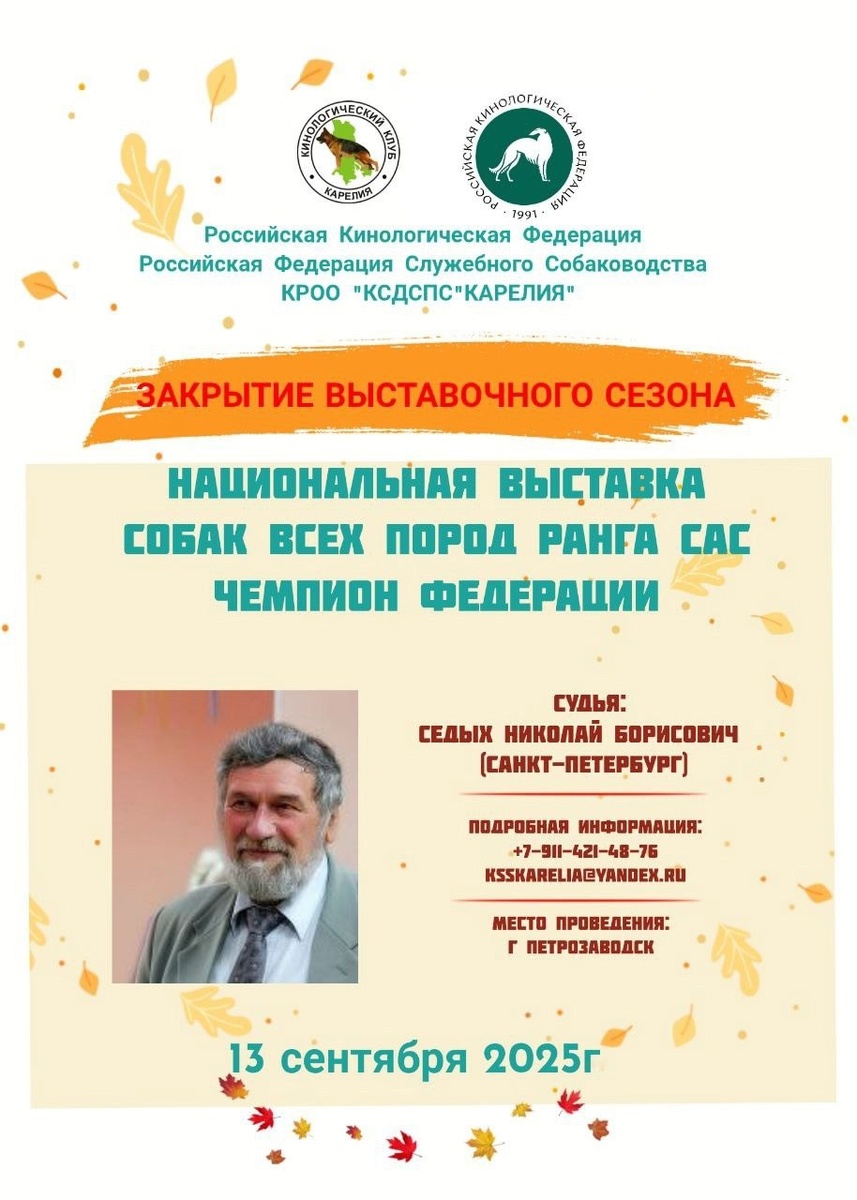 ⏰ 13 сен (7д) 🏛 #Петрозаводск #Россия #Выставка 🐶 Выставка собак: КСДСПС "Карелия" 🏆 Клуб служебного, декоративного, спортивно-прикладного собаководства "Карелия" Контакты организаторов здесь: 🌐 https://www.petsman.ru/vystavki-sobak.php?mesto=49-petrozavodsk НАЦИОНАЛЬНЫЕ ВЫСТАВКИ СОБАК ВСЕХ ПОРОД САС, Чемпион Федерации (РКФ, РФСС) 🧑 👨 Эксперты: 🔹 Седых Николай (СПб)