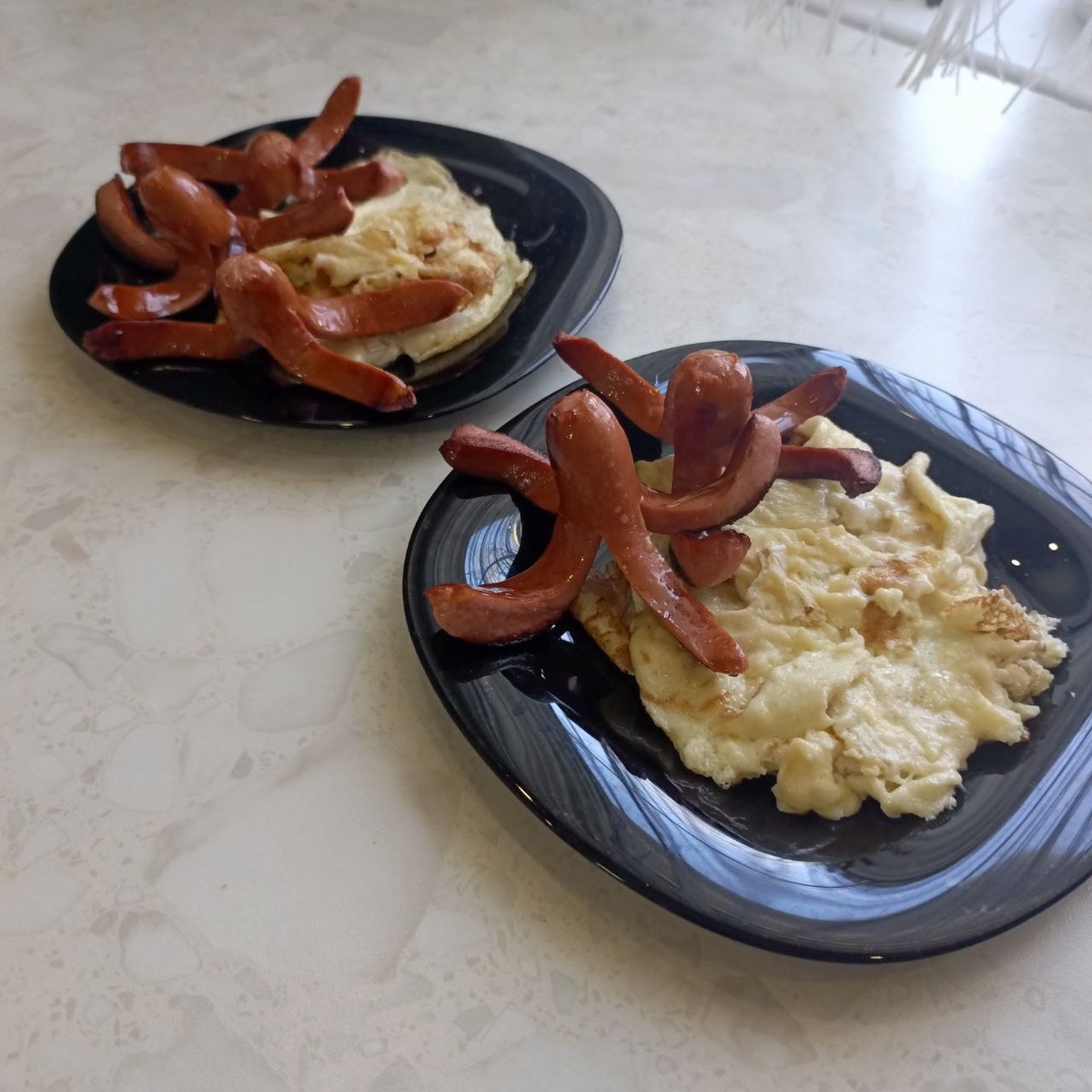 Просто омлет с сосиками это скучно... Но если это Бабушкин омлет с жареными осьминогами это уже заявка на пиратскую кухню 😁. И всегда заходит на ура! Дочь в восторге! А что еще нужно? 😏 Всем доброго субботнего утра!