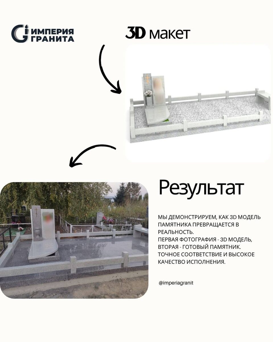 Мы демонстрируем, как 3D модель памятника превращается в реальность. Первая фотография — 3D модель, вторая — готовый памятник. Точное соответствие и высокое качество исполнения. 🤍🙏🏻