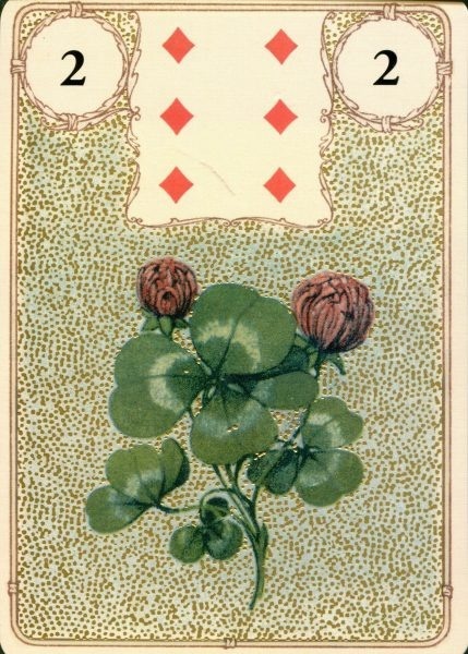 Маленькая да удаленькая, вторая по порядковому счёту карта в системе Ленорман. Чаще всего на ней изображают четырёхлистный клевер, старинный символ удачи, улыбки небес и благосклонности Фортуны. Действительно карта показывает, что события будут иметь благоприятный исход для Вас, но как и в каждой истории есть свои нюансы... Обратим внимание на порядковый номер карты.-это двоечка, как и сам клевер небольшая цифра, так вот и удача получается не сильно большая, но часто приятная! Сейчас, с развитием искусственного интеллекта, людей издающих свои авторские колоды, стало на порядок больше и каждый создаёт колоду на свой вкус. Но на что я всегда обращаю внимание в колодах Ленорман- это в первую очередь на наличие порядковых номеров и игральных карт! Про удивительный и не похожий ни на что симбиоз игральных карт и 36 изображений в системе Ленорман можно говорить долго, люди пишут отдельные книги на эту тему и для меня наличие этих символов тоже важно в мантической работе. Шестёрка бубновая и