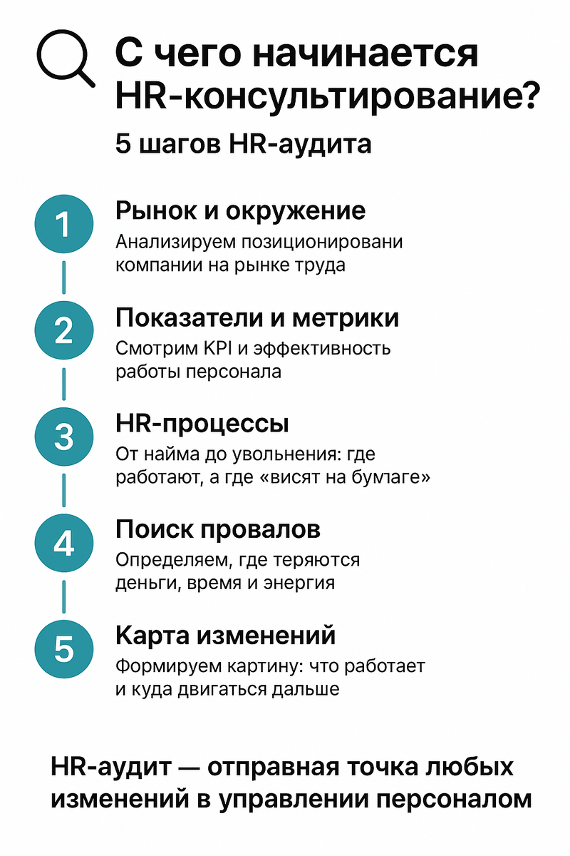 HR-аудит — это не отчёт ради отчёта. Это отправная точка: без понимания текущей ситуации невозможно строить систему, которая будет работать на эффективность и прибыльность бизнеса.