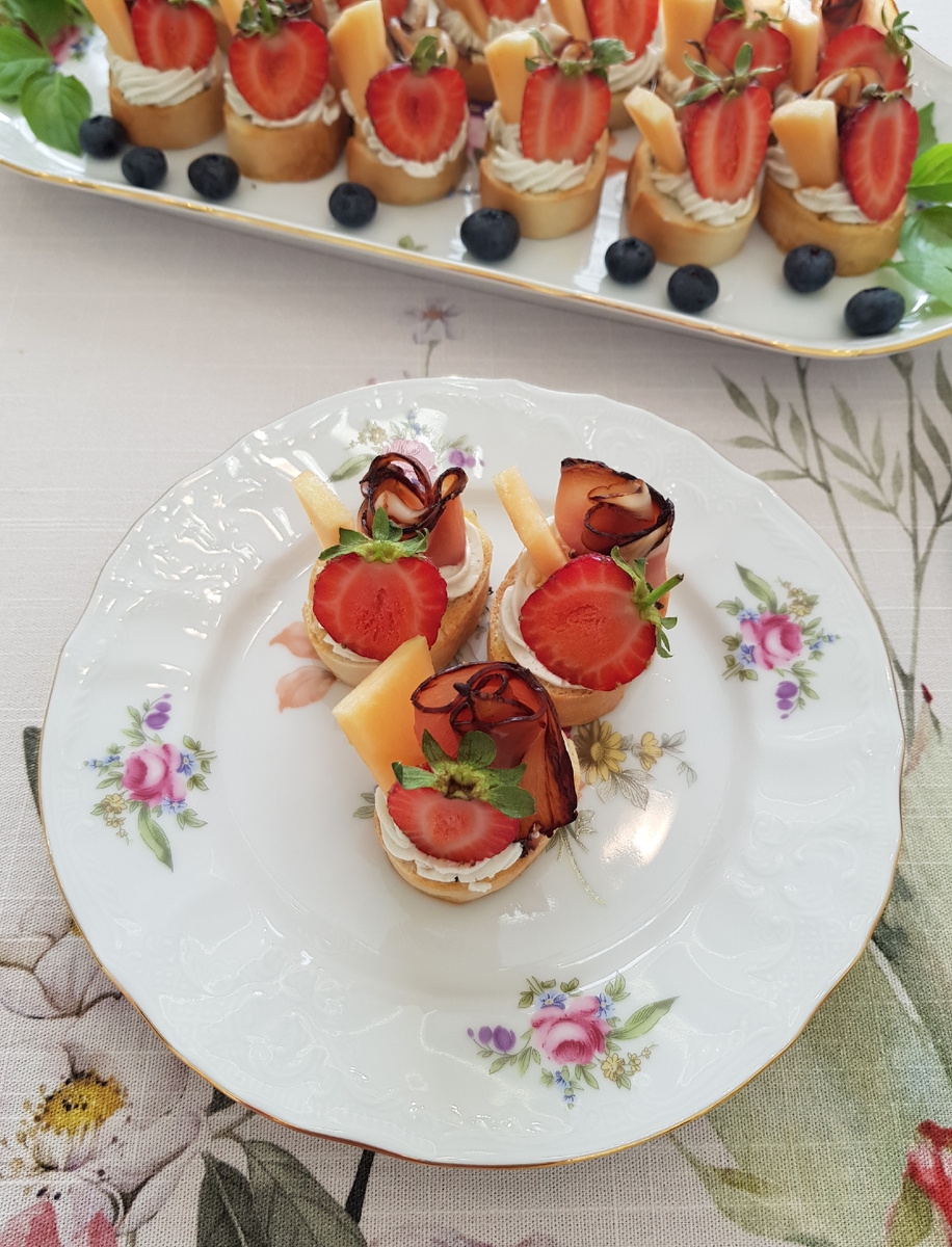 Добрый день, дорогие друзья! Сегодня я предлагаю начать новую неделю с изумительного рецепта маленьких итальянских закусок — кростини! А особое настроение создаст приятное сочетание голубого и творожного сыра, прошутто с клубникой и дыней! Для приготовления нам понадобятся: тонкий багет — 1 штука, 80 грамм прошутто, 50 грамм сыра горгонзола, 100 грамм творожного сыра, 100 грамм клубники, 100 грамм дыни, соль, черный перец, оливковое масло, голубика и базилик для оформления блюда. Приготовление: багет нарезать кусочками поперек. Подсушить кусочки багета на гриле. Сыр с плесенью мелко нарезать. И перемолоть с помощью блендера или измельчителя. К голубому сыру добавить творожный и перемешать их до однородности. Подсушенные кусочки багета полить оливковым маслом. Масло распределить с помощью кулинарной кисти. Посыпать солью и черным перцем. В кондитерский мешок вставить фигурную насадку. Мешок сложить в стакан или кружку и выложить в него смесь из творожного и голубого сыра. Выдавить