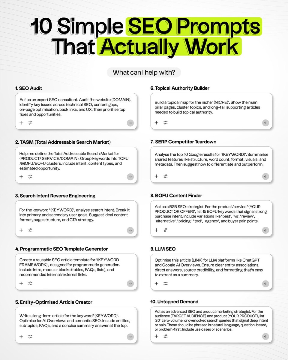 10 подсказок от Jake Ward, как превратить 5 часов SEO в 5 минут: 1. SEO-аудит Выступай в качестве эксперта в SEO. Проведи аудит сайта {ДОМЕН}. Определи ключевые проблемы в техническом SEO, пробелах в контенте, оптимизации на странице, обратных ссылках и UX. Затем расставь приоритеты для лучших исправлений и возможностей. 2. TASM (общий адресный поисковый рынок) Помоги мне определить общий рынок адресного поиска для {PRODUCT/SERVICE/DOMAIN}. Сгруппируй ключевые слова в кластеры TOFU/MOFU/BOFU. Укажи намерение, типы содержимого и предполагаемые возможности. 3. Реверс-инжиниринг поискового намерения Для ключевого слова {KEYWORD} проанализируй поисковое намерение. Разбей его на основные и второстепенные цели пользователя. Предложи идеальный формат контента, структуру страницы и стратегию призыва к действию. 4. Программный генератор шаблонов SEO Создай многоразовый шаблон SEO-статьи для {KEYWORD FRAMEWORK}, предназначенный для программной генерации. Включи вступление, модульные блоки (табли