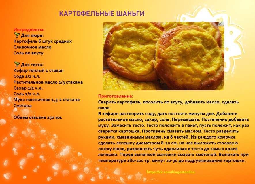 🥟 КАРТОФЕЛЬНЫЕ ШАНЬГИ 🌀 Ингредиенты: Для пюре: Картофель 6 штук средних Сливочное масло Соль по вкусу 💛 Для теста: Кефир теплый 1 стакан Сода 1/2 ч.л. Растительное масло 1/3 стакана Сахар 1/2 ч.л. Соль 1/2 ч.л. Мука пшеничная 1,5-2 стакана Сметана 🥛 Объем стакана 250 мл. 🌀 Приготовление: Сварить картофель, посолить по вкусу, добавить масло, сделать пюре. В кефире растворить соду, дать постоять минуты две. Добавить растительное масло, сахар, соль. Перемешать. Постепенно добавить муку. Замесить тесто. Тесто положить в пакет, пусть полежит, как раз сварится картошка. Противень смазать маслом. Тесто разделить руками, смазанными маслом, на 8 частей. Из каждого комочка сделать лепешку диаметром 8-10 см, на нее выложить столовую ложку пюре, разровнять чуть вдавливая в тесто до самых краев лепешки. Перед выпечкой шанежки смазать сметаной. Выпекать при температуре 180-200 гр. минут 20-30 до подрумянивания картошки.