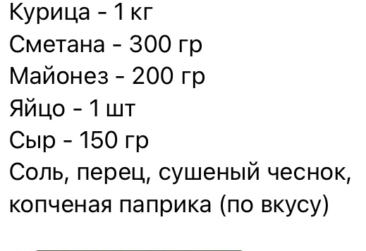 Всем привет! Я рада, что вы снова заглянули ко мне на канал))) Сегодня я вам предлагаю очень вкусный и быстрый рецепт курочки в духовке в заливке. Итак начнем! ИНГРЕДИЕНТЫ У меня мякоть бедра, вы можете брать филе , но предварительно его нужно отбить. Солим, перчим и добавляем сухой чеснок. Смешиваем сметану, майонез и яйцо. В эту смесь - заливку, добавляем тертый сыр и копчению паприку. Смазываем сверху каждый кусочек курочки и оставляем минут на 15-20. Затем в духовку разогретую на 180 градусов минут на 20-25 . До готовности. Курочка получается очень вкусная и нежная. Обязательно попробуйте! Приятного аппетита ❤️❤️❤️ приглашаю вас в мой телеграмм канал курочкавдуховке #рецепты #домашняякухня #пловкусно #готовимдома #ужин #вкусноипросто #курица #завтрак #кулинария
