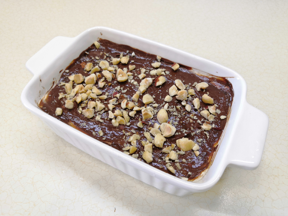 4. Горький шоколад и молоко нагреть в микроволновке, не кипятить. Хорошо перемешать. Выложить сверху на крем и посыпать орехами