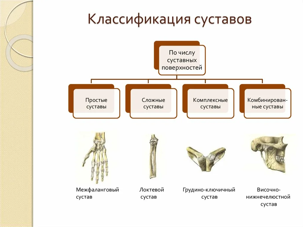 По количеству сочленяющихся костей и форме их суставных поверхностей суставы могут отличаться друг от друга. Сустав, образованный только двумя суставными поверхностями, называется простым, а сустав из трех и более суставных поверхностей — сложным. Различают суставы: По форме суставных поверхностей суставы делятся на: Встречаются и варианты вышеперечисленных форм суставов. Например, разновидностью цилиндрического сустава является блоковидный сустав, шаровидного — чашеобразный и плоский суставы. Форма суставных поверхностей определяет оси, вокруг которых происходит движение в данном суставе. Больше полезных материалов вы можете найти в наших каналах в Телеграм и МАХ.