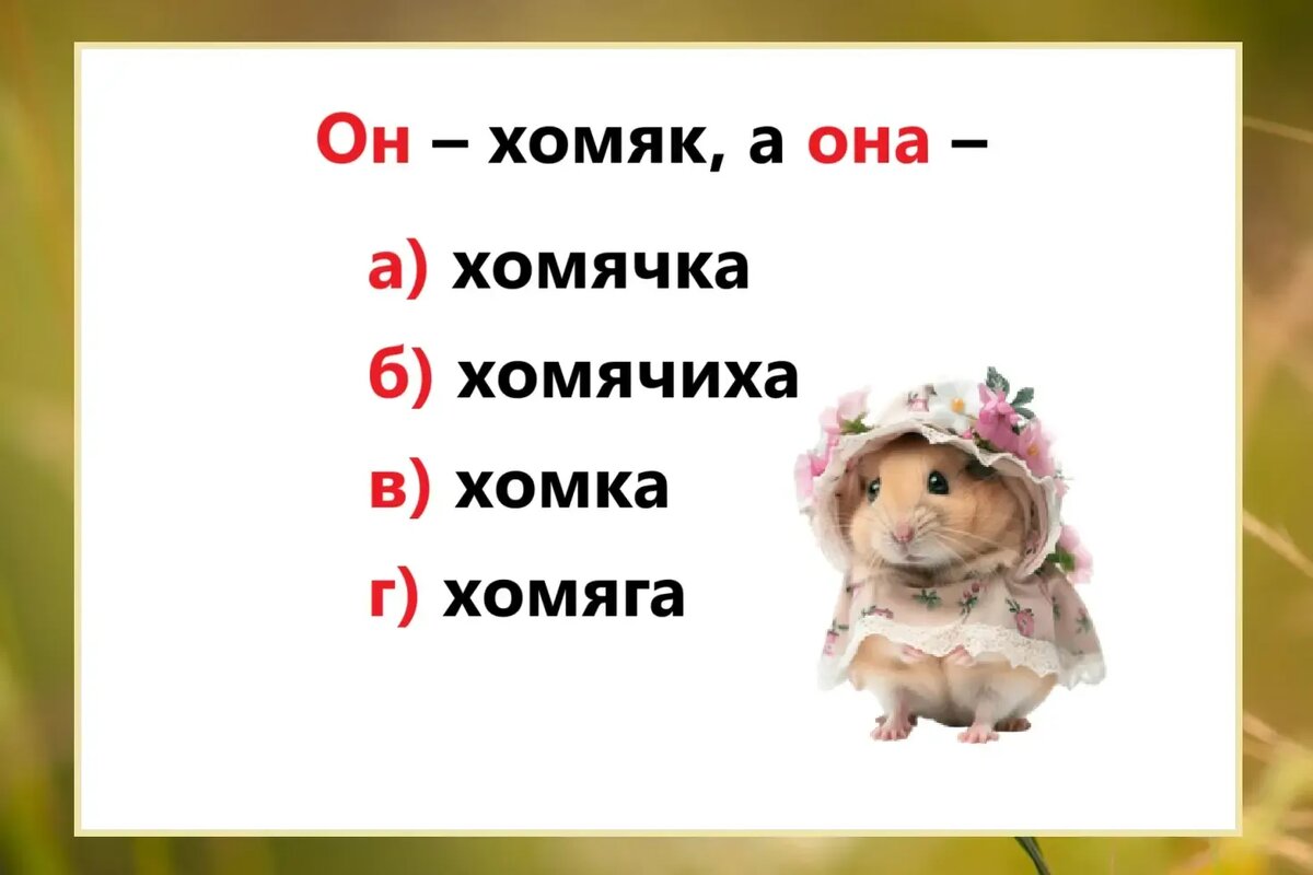Хомяки — некрупные грызуны, очень милые внешне. Самку хомяка правильно называть «хомячиха» (так же, как и самку кролика — крольчихой).