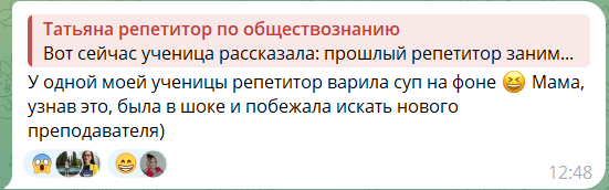 И тут же история про репетитора, который варил суп во время занятия. Только вот в этой истории одна загвоздка - она это делала при включённой камере. А это, очевидно, глупо и непрофессионально. Надо как раз выключить камеру - и тогда никто не узнает, чем ты занимаешься, пока ученик дрожащими руками выводит на онлайн доске решение элементарной задачи.