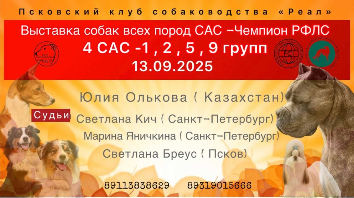 ⏰ 13 сен (7д) 🏛 #Псков #Россия #Выставка 🐶 Выставка собак: Реал - Золотая осень - 2025 🏆 Клуб собаководства "Реал" Контакты организаторов здесь: 🌐 https://www.petsman.ru/vystavki-sobak.php?mesto=54-pskov ✅ Выставка собак всех пород, ранга САС-Чемпион Федерации (РФЛС) 🍁« Реал -Золотая осень -2025»🍁 ✅Выставка САС 1 группы FCI ✅Выставка САС 2 группы FCI ✅Выставка САС 5 группы FCI ✅Выставка CAC 9 группы FCI 🧑 👨 Эксперты: 🔹 Юлия Олькова (Казахстан) 🔹 Светлана Кич (г. Санкт- Петербург) 🔹 Марина Яничкина (г. Санкт-Петербург) 🔹 Светлана Бреус (г. Псков)