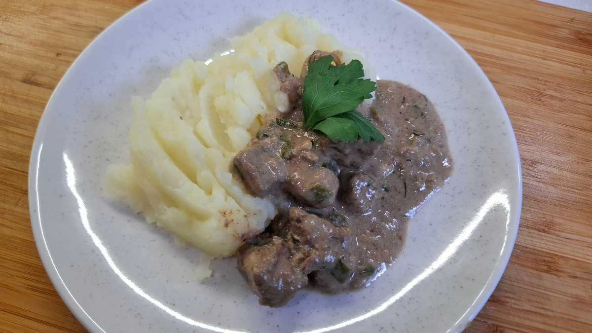 Хотите приготовить вкусный и полезный ужин за полчаса? Бефстроганов из говяжьей печени - идеальный вариант! Богатый железом, нежный и сочный, он станет отличным блюдом для всей семьи. Даже я, которая не любит вкус печани с удовольствием его ела, ведь печеночного вкуса почти не ощущается. Печень нужно промыть и порезать средними кусочками. У меня была замороженная печень, я ее сначала разморозила, помыла, убрала пленки, потом порезала и помыла еще раз. Как говорит моя бабушка, из уже порезанной печени кровь вымывается лучше. Печень немного просушиваем бумажным полотенцем, складываем в глубокую посуду и добавляем 2 столовые ложки муки. Тщательно перемешиваем, чтобы мука равномерно распределилась по кусочкам. На сковороде разогреваем растительное масло и обжариваем печень. Быстро-быстро на сильном огне со всех сторон до образования корочки. Добавляем в сковороду нарезанный полукольцами лук. Перемешиваем и обжариваем 2–3 минуты на среднем огне. Добавляем соль, перец и мускатный орех по вку