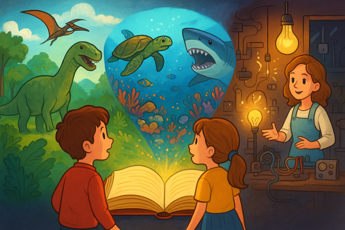 Книга снова засияла, и брат с сестрой очутились посреди огромного леса. Вокруг гремели шаги, от которых дрожала земля. Из-за деревьев вышло громадное существо с длинной шеей. — Это бронтозавр! — воскликнул Миша, вспоминая картинки из энциклопедии. Бронтозавр мирно щипал листья, а в небе кружили птеродактили. Но вскоре раздался рёв, и на поляну вышел огромный тираннозавр. — Вот так встреча! — прошептала Катя. — А он точно нас не заметит? Фея Знаний успокоила их: — Мы здесь как гости из будущего. Они нас не видят. Динозавры вымерли миллионы лет назад, но они были настоящими хозяевами Земли. В следующий миг дети оказались в подводном мире. Вокруг плавали разноцветные рыбы, а мимо медленно проплывала огромная черепаха. — Ого, какие красивые кораллы! — сказала Катя. — Они как цветы! Фея объяснила: — Кораллы — это не растения, а колонии маленьких живых существ. Они создают целые города для рыб и морских обитателей. Вдруг из темноты выплыло огромное существо с зубастой пастью. — А это акула!