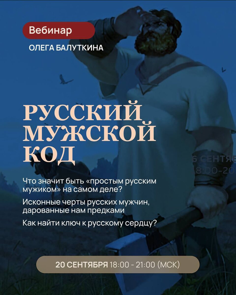 РУССКИЙ МУЖСКОЙ КОД Как найти ключ к русскому сердцу? Вебинар Олега Балуткина Что приходит вам в голову при словах «простой русский мужик»? Физическая сила и мощь, простота, смекалка, доброта души? Преданность семье и делу? А может, грубоватое «Я сказал…»? Исконный русский характер — сложная конструкция. В каждом русском мужчине живёт память славных предков: воинов, земледельцев и первопроходцев. Но также и многовековая боль, надломленность и «угловатость». Русский мужик — «широк, сузить бы…» В современном мире его образ сильно искажён. За словами «будь мужчиной», который хоть раз произносила каждая женщина, скрывается всё, что угодно, но очень редко то, что есть на самом деле и кем этот мужчина может и готов быть. А сами ожидания полны противоречий. Женщины ищут силу, но часто находят лишь её имитацию. Или наоборот, столкнувшись с силой, не могут её принять. Вступают в борьбу за лидерство там, где надо занять своё место. Ломают и подчиняют, когда достаточно просто любить. Ве