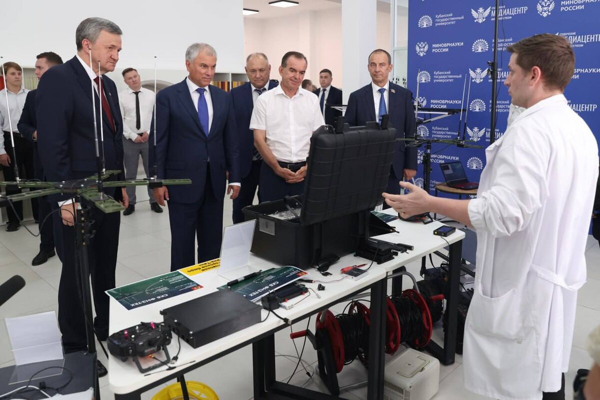 В рамках рабочей поездки в Краснодар Председатель Государственной Думы Российской Федерации Вячеслав Володин вместе с губернатором Краснодарского края Вениамином Кондратьевым и депутатом Госдумы Иваном Демченко побывали в Кубанском государственном университете. Визит был приурочен к 105-летию вуза. Сегодня КубГУ — один из крупнейших научно-образовательных центров Юга России, в котором обучается свыше 32 тысяч студентов и аспирантов. Делегация ознакомилась с ключевыми направлениями работы университета, в том числе с научно-техническими проектами студентов, инициативами волонтёрского центра, библиотечным фондом и спортивной инфраструктурой. Особое внимание было уделено стартапам и инженерным разработкам, реализуемым при поддержке преподавателей. Гости отметили высокий уровень подготовки студентов, а также роль наставников, формирующих у молодёжи критическое мышление и стремление к профессиональному росту.