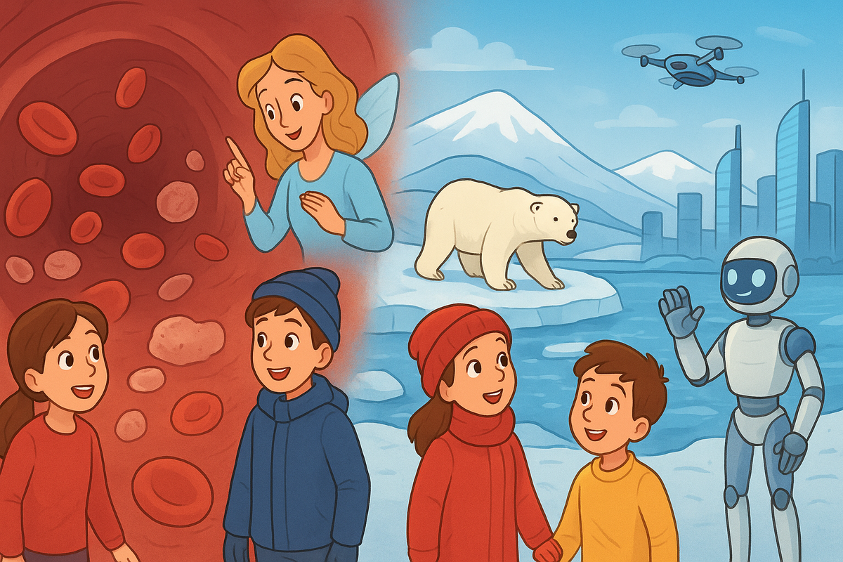 Книга засветилась ярким светом, и дети очутились внутри огромного красного туннеля. Всё вокруг двигалось, пульсировало и переливалось. — Где мы? — удивлённо спросила Катя. — Это человеческое тело! — ответила фея. — Вы находитесь внутри кровеносного сосуда. Вокруг проплывали красные клетки, похожие на маленькие лодочки. Они несли кислород, чтобы питать всё тело. А рядом мелькали белые клетки — защитники, которые сражаются с микробами. — Значит, в нас целая армия живёт? — восхитился Миша. Фея кивнула: — Да, именно так. Каждый из вас — это целая вселенная из триллионов клеток. Вдруг вокруг стало очень холодно. Дети оказались среди снежных просторов. Белые медведи осторожно шагали по льду, а рядом плавали моржи. — Ого, как тут холодно! — Катя закуталась в воображаемый шарф. — Здесь живут удивительные животные, — сказала фея. — Они умеют выживать в морозах. Но сейчас Арктика меняется: лёд тает, и животным становится труднее. Миша нахмурился: — Значит, мы должны беречь природу, чтобы белые м