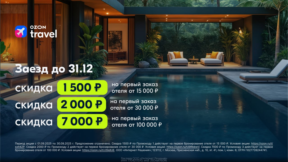 Озон Тревел дает скидки на бронирование отелей и покупку авиабилетов. Рассмотрим оба примера.
