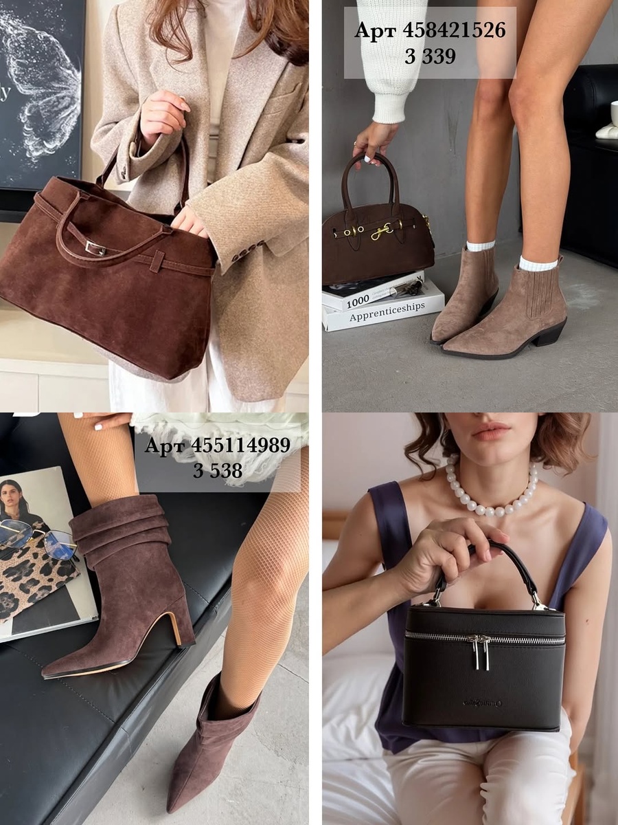 Хочешь «собрать» стильный осенне-зимний гардероб без долгих поисков? Я отобрала самые удачные модели сумок и обуви с Wildberries, которые реально работают в образах: вытягивают силуэт, добавляют текстуры и «дорогого» настроения. Каждый товар — с артикулом и разбором. Артикул: 458421526 Почему это «да»: мягкая замша в благородном таупе, аккуратный скошенный каблук 3–4 см, заострённый нос. Нога выглядит изящно, но обувь при этом очень удобна. С чем носить: прямые и широкие джинсы, кожаные брюки, мини-юбки с плотными колготками. Совет стилиста: поддержи тёплый оттенок обуви сумкой в шоколадной гамме или пальто цвета латте. Артикул: 455114989 Фишка модели: драпированное голенище, острый нос и каблук-шпилька. Такой крой визуально удлиняет ноги. Как сидят: мягкая замша комфортно облегает икру, не сдавливая. С чем носить: мини-юбки-плиссе, шерстяные платья, пальто-халаты. Совет стилиста: уравновесь эффектные сапоги свитером оверсайз, чтобы образ не ушёл в «гламур». Артикул: 269336401 Что по