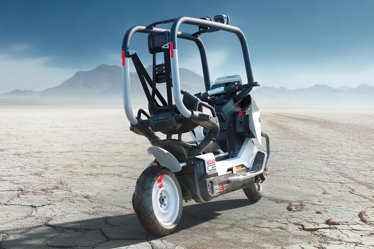 У BMW Motorrad Vision CE более «зубастые» шины, чем у CE 04, на которых можно кататься по лесным тропам и прочему относительно ровному и твёрдому грунту. Металлический трубчатый каркас служит главным образом для защиты водителя, но также может выступать в качестве крыши и экспедиционного багажника — нужно только прикрутить к нему соответствующую надстройку. К передней поперечине этого каркаса уже прикручены два дополнительных светодиодных фонаря, пишут «Колёса.ру».