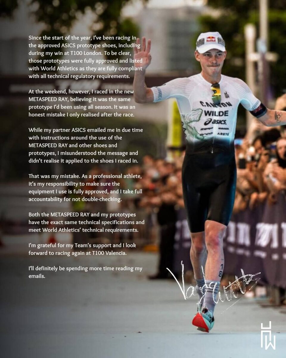 Ну что сказать. Хайден признал, что сам накосячил с кроссовками. Он написал следующее: «С начала года я участвовал в соревнованиях в утвержденных прототипах обуви ASICS, в том числе во время моей победы на T100 London. Хочу уточнить, что эти прототипы были полностью одобрены и зарегистрированы в World Athletics, поскольку они полностью соответствуют всем техническим нормативным требованиям. Однако в минувшие выходные я участвовал в соревнованиях в новых кроссовках METASPEED RAY, полагая, что это тот же прототип, который я использовал весь сезон. Это была честная ошибка, которую я осознал только после соревнований. Хотя мой партнер ASICS своевременно прислал мне по электронной почте инструкции по использованию METASPEED RAY и других кроссовок и прототипов, я неправильно понял сообщение и не осознал, что оно относится к кроссовкам, в которых я участвовал в соревнованиях. Это была моя ошибка. Как профессиональный спортсмен, я несу ответственность за то, чтобы оборудование, которое я и