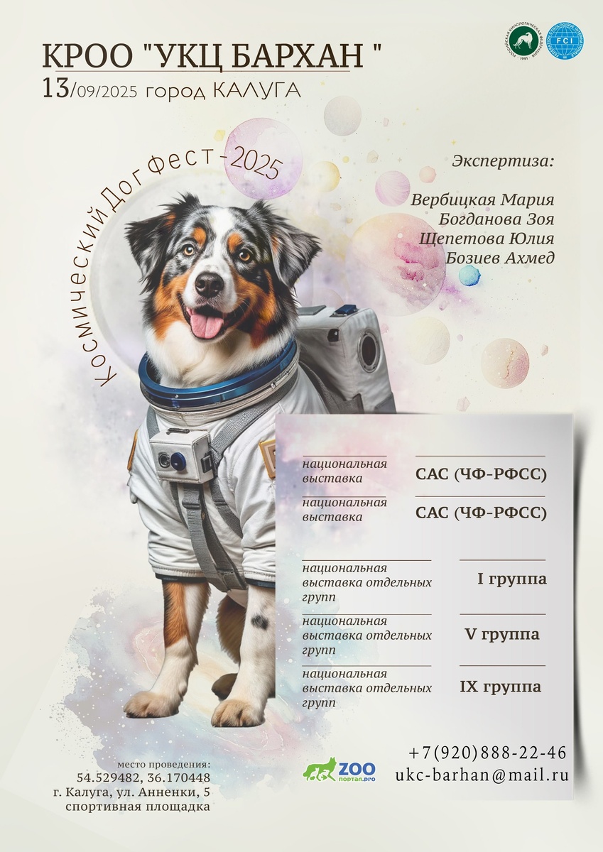 ⏰ 13 сен (7д) 🏛 #Калуга #Россия #Выставка 🐶 Выставка собак: КОСМИЧЕСКИЙ ДОГ ФЕСТ 🏆 Учебно-кинологический центр "Бархан" Контакты организаторов здесь: 🌐 https://www.petsman.ru/vystavki-sobak.php?mesto=118-kaluga Выставка собак всех пород "КОСМИЧЕСКИЙ ДОГ ФЕСТ-1" ранга САС ЧФ Выставка собак всех пород "КОСМИЧЕСКИЙ ДОГ ФЕСТ-2" ранга САС ЧФ Национальная выставка собак пород 1 группы ранга САС Национальная выставка собак пород 5 группы ранга САС Национальная выставка собак пород 9 группы ранга САС 🧑 👨 Эксперты: 🔹 МАРИЯ ВЕРБИЦКАЯ (БЕЛАРУСЬ) 🔹 ЗОЯ БОГДАНОВА (РОССИЯ) 🔹 АХМЕД БОЗИЕВ (РОССИЯ) 🔹 ЮЛИЯ ЩЕПЕТОВА (РОССИЯ)