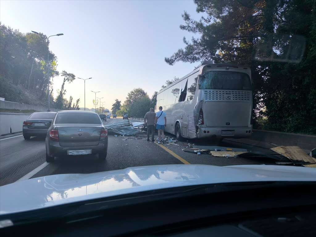 Авария произошла сегодня утром на автодороге «Сочи – Адлер» недалеко от Кудепсты. Информация о происшествии появилась в телеграм-канале «ДТП Сочи». По свидетельству очевидцев, водитель грузовой «Газели» не справился с управлением и протаранил ехавший впереди автобус. Автобус получил вмятину слева-сзади, повреждено заднее и боковое остекление в районе удара. При этом, автомобиль виновника ДТП пострадал гораздо более существенно – кузов «Газели» просто рассыпался и завалил своими кусками несколько десятков метров дороги, создав трудности для движения другим машинам. О пострадавших пока неизвестно. Фото: ДТП Сочи / t.me/dtp_sochi