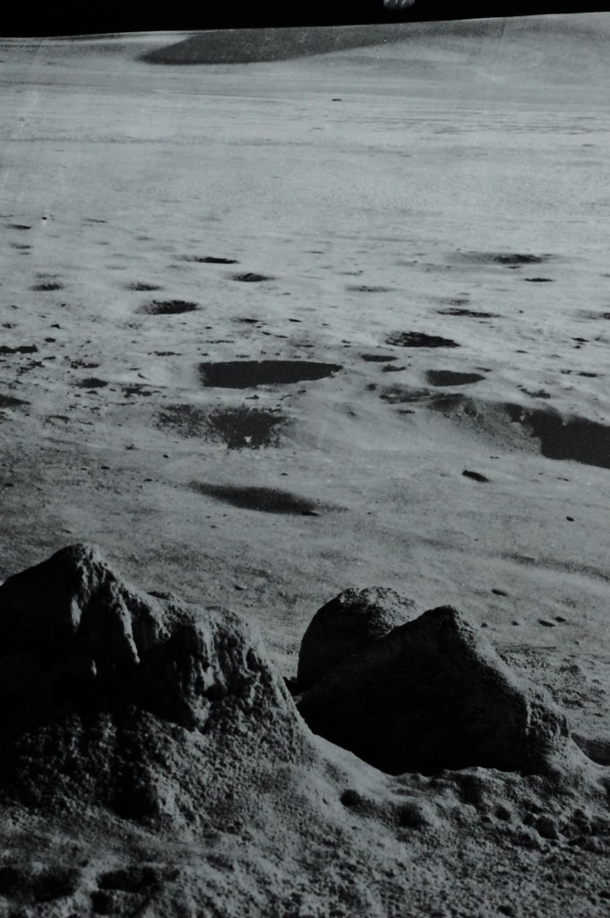 Сегодня Луноход перевыполнил план, нарушив взятое обязательство "В день по лунной фотке" зачеркнуто "В день по снимку лунной поверхности". Но что поделаешь, если камера постоянно захватывает следы присутствия пилотируемой высадки на Луне. Небольшой поворот камеры градусов на тридцать и следы пилотируемой высадки на поверхность Луны из кадра как из песни уже не выкинуть. Так что сегодня у нас в некотором роде - панорама с присутствием следов пилотируемой высадки на Луну. Можно склеивать отдельные снимки в панораму и отсылать свидетелям лунных высадок НАСА - они такое любят.