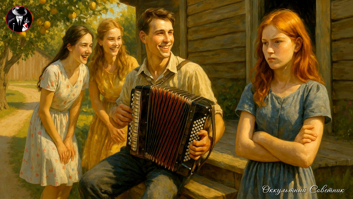Николай сидел на крыльце, гармошка в руках переливалась на августовском солнце. Вокруг собрались девчонки — слушали, вздыхали. А четырнадцатилетняя Катя стояла в стороне, кусая губы от ревности.