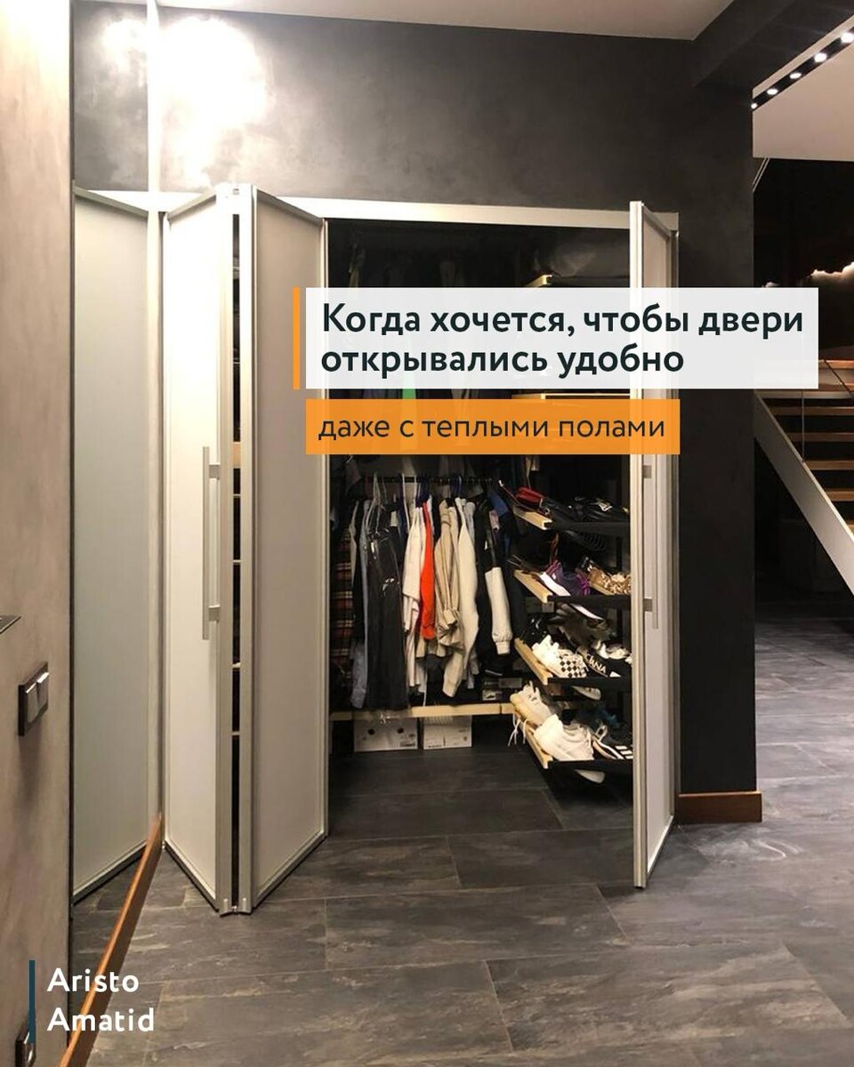 Клиенты уже заказывали у нас гардеробную в узкую нишу со складными дверьми и обратились повторно. Изначально заказали гардеробную систему и 3 двери-купе. Хотели, чтобы отодвигалась только средняя, а крайние были стационарными — был важен именно центральный проход. На установке гардеробной наш монтажник предложил установить 1 складную дверь и 1 распашную: так получится максимально открывать проем за 1 раз. Заказчикам идея понравилась. В основном будут открывать левую складную дверь, чтобы зайти внутрь гардеробной. Правую распашную дверь открывать практически не будут — она закрывает только полки, а не проход. Теплые полы в доме не стали проблемой. В случае этой работы было 4 см стяжки, можно было поставить любые двери без проблем. •Консультируем здесь @Amatidru •Или по тел.: +79219170608 •3 салона СПб, монтажные бригады СПб и Мск •Отправляем в другие города •Можно купить в рассрочку