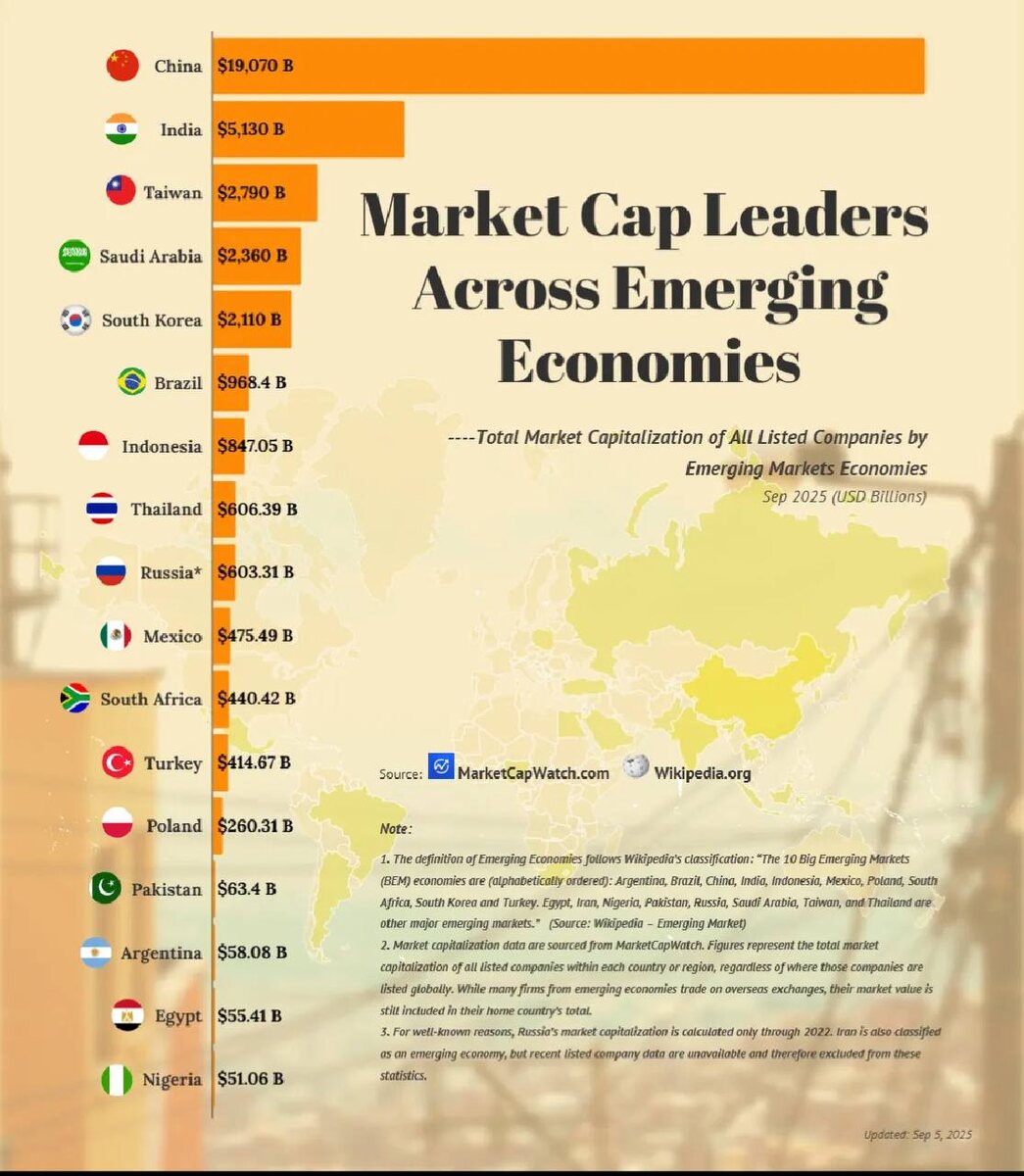 🌍 Развивающиеся рынки: где рост, а где иллюзия? Китай держит первое место: $19 трлн капитализации компаний. Для сравнения, Индия всего $5 трлн. Разница как между iPhone и кнопочной «Нокией». 🇹🇼 Тайвань живёт за счёт одной TSMC. 🇸🇦 Саудовская Аравия - это в основном Aramco. 🇰🇷 А Южной Корее - Samsung. Видите тренд? В половине стран весь рынок завязан на одной компании. Упала бы она и вместе с ней вся экономика в минус. Россия в статистике застряла в 2022-м на уровне ~$600 млрд. Дальше цифры просто перестали считать. 💡В статистике всё выглядит солидно - триллионы, рост, лидеры. Но по факту это часто казино на одного крупного игрока. Выигрывает, и все хлопают. Проигрывает - всем больно. Telegram | YouTube