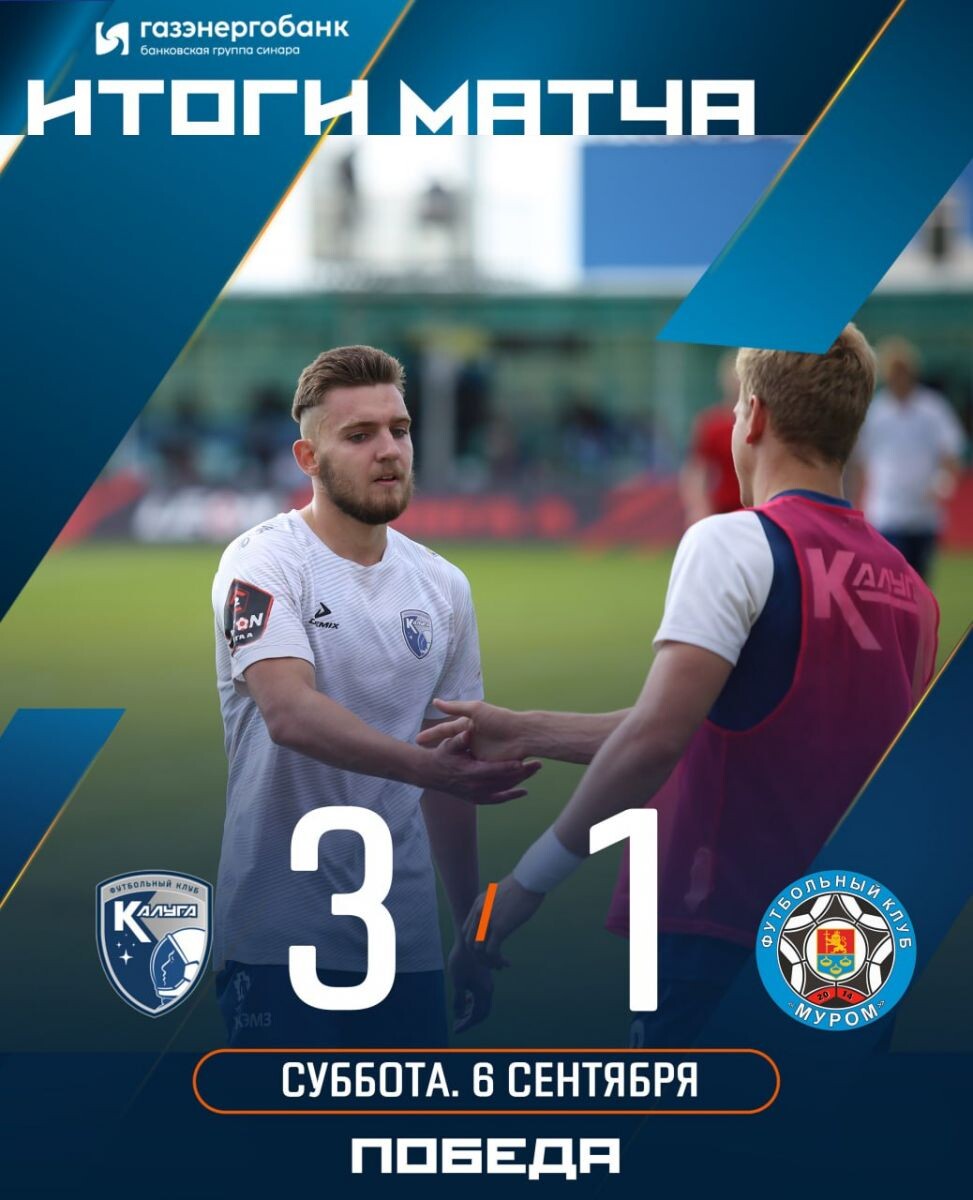 Завершился матч в рамках Второй лиги Дивизиона А между ФК «Калуга» и ФК «Муром». Встреча, проходившая на центральном стадионе города Калуги, завершилась победой хозяев поля со счетом 3:1. На 43-й минуте матча первый гол был забит нападающим калужской команды Югалдиным, который поразил ворота муромской команды. Во втором тайме, на 67-й минуте, футболист «Мурома» Ерохин сравнял счет. Однако спустя три минуты, на 70-й минуте встречи, Югалдин оформил дубль, вторично отправив мяч в сетку ворот гостей. На 83-ей минуте Югалдин забил третий гол и принес своей команде победу. По итогам состоявшейся игры ФК «Калуга» сохраняет первую позицию в турнирной таблице. ФК «Муром» по-прежнему занимает четвертое место в общем зачете. Следующую игру ФК «Калуга» проведет 14 сентября в 17:00 по московскому времени. Калужане сыграют против курского «Авангарда».