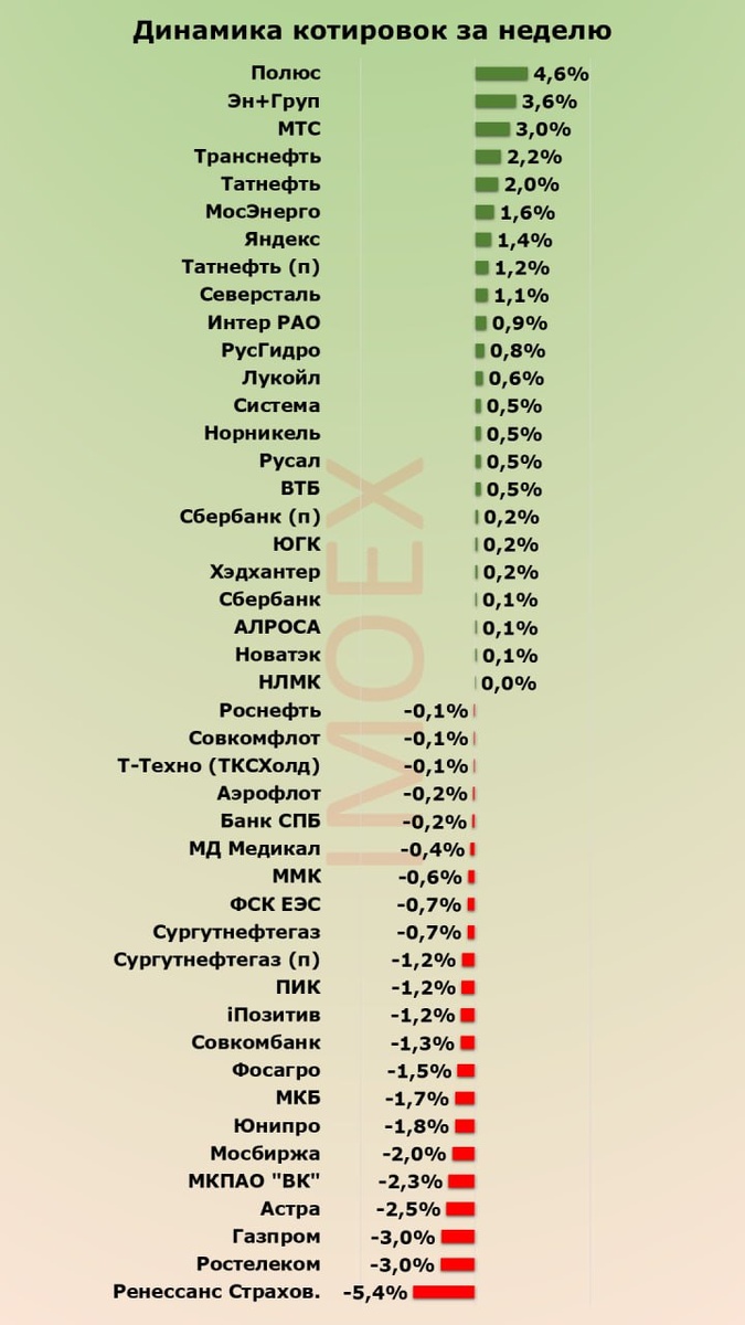 Теперь о пятёрке акций Индекса Мосбиржи, показавших лучшие результаты за неделю: