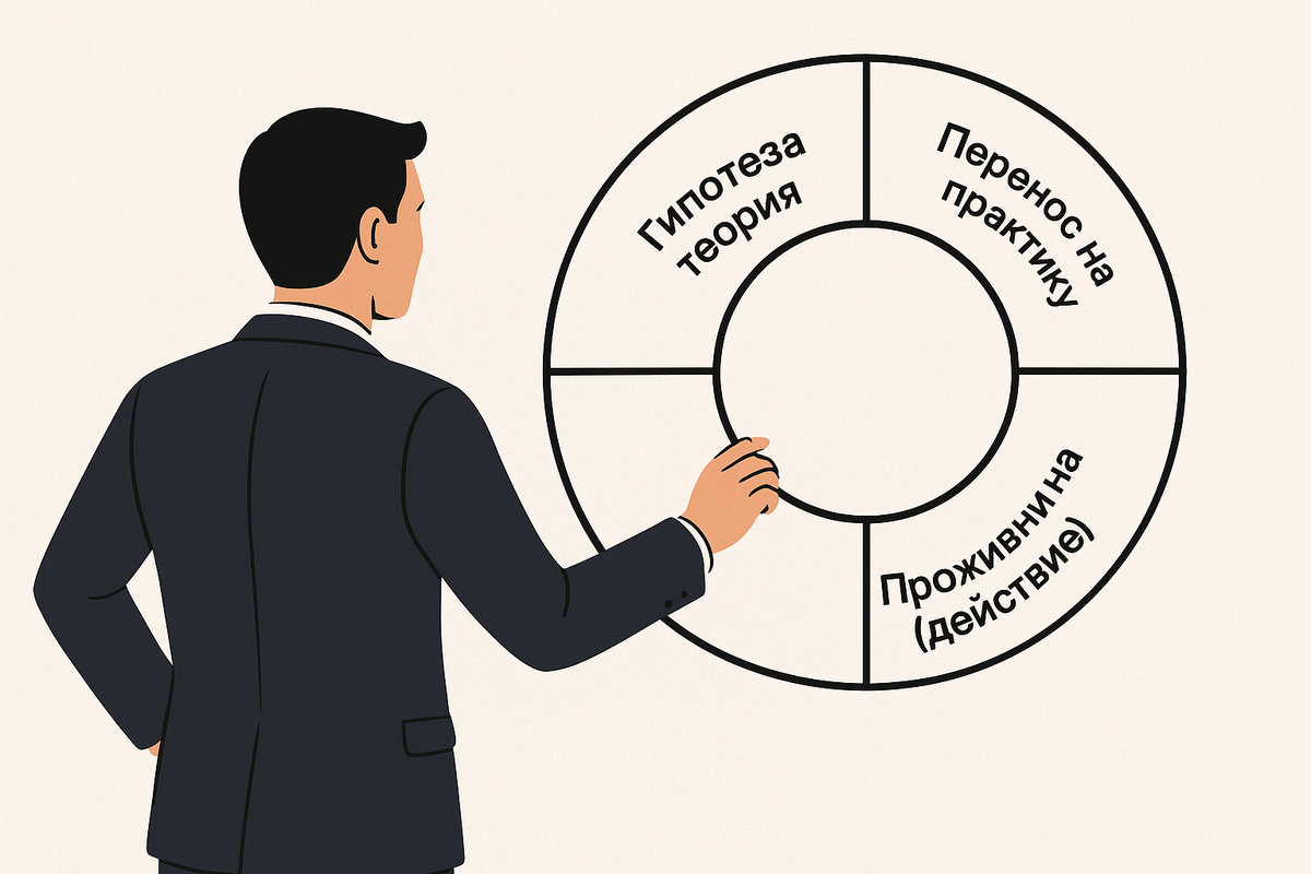 Мы часто думаем, что обучение в команде начинается с действий: «сделай вот так, поступай по-другому». Но если присмотреться, любое настоящее изменение всегда начинается раньше — с гипотезы. Это то место, где в голове у человека появляется мысль: «А что если попробовать вот так?» Эту логику отлично объясняет эмпирический цикл познания Колба. Он показывает, что путь к новому результату проходит через четыре этапа: сначала гипотеза или теория, потом проверка этой гипотезы в реальном опыте, затем рефлексия — осмысление того, что получилось, — и только после этого формируются новые установки и убеждения. И вот здесь в игру вступает лидер. Его роль — не тащить команду силой, а управлять самим процессом прохождения цикла. Сначала дать импульс к формированию гипотезы: задать вопрос, бросить вызов, предложить иной взгляд. Дальше — создать условия, где эту гипотезу можно попробовать на практике: маленький проект, новый формат взаимодействия, необычный подход к клиенту. Потом удержать команду в з