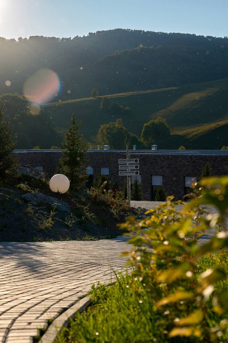 Красивое закатное солнце на территории нового отеля нашего курорта – «Среди Гор» 🏔️ Гости отмечают, что здесь, в окружении леса, невероятно вкусный воздух, который хочется забрать с собой 🤍
