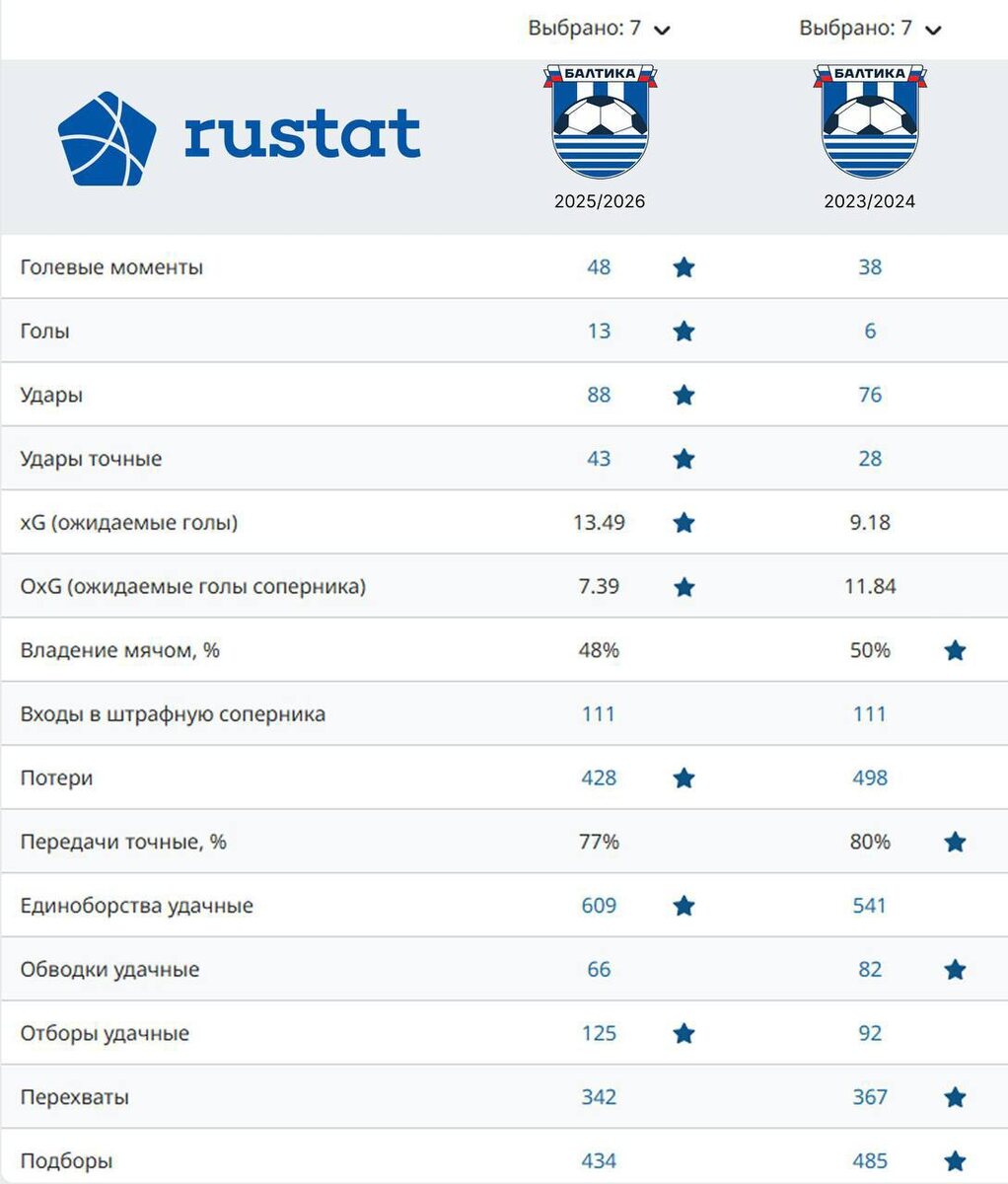 РУСТАТ подготовил сравнение наших стартов в РПЛ 23/24 и 25/26. В первом сезоне после семи туров мы набрали три очка и забили шесть мячей. А прямо сейчас в нашем активе 15 баллов и 13 голов.