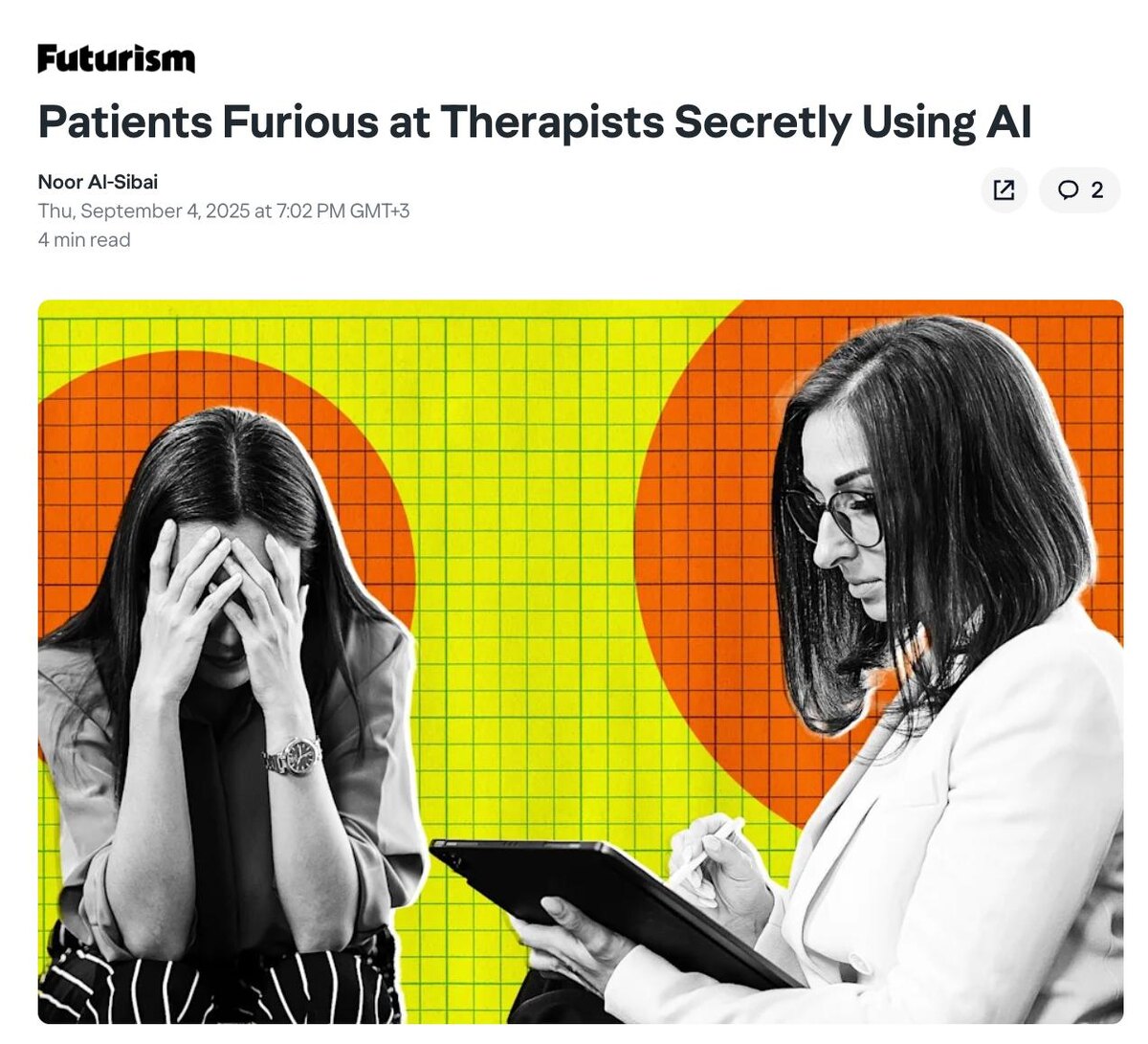На всякий случай, если вы не читали посты про ИИ-убийство и про ИИ-самоубийство, то хотим напомнить: пытаться решить ментальные проблемы с помощью ИИ или пытаться сделать из нейросети себе друга — это кринж. Но даже профи этого не знают. Оказывается, психотерапевты сами используют ИИ в работе. Исследование MIT описывает случаи, когда врачи тайно давали клиентам ответы ChatGPT прямо на сеансах или в переписке, выдавая их за свои. Некоторые пациенты это разоблачали и чувствовали себя преданными. Представляете себе: вы платите за эмпатию и поддержку от живого человека, а получаете ответ от ИИ и врачебную тайну, раскрытую алгоритмам. @lobushkin