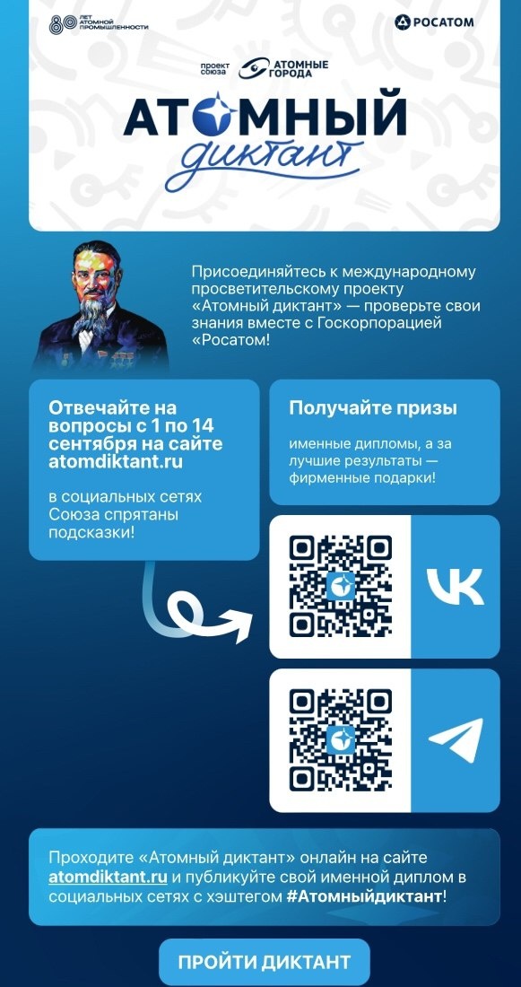✍С 1 по 14 сентября можно пройти атомный диктант онлайн. На страницах Союзf «Атомные города» (ВК) и ТГ (t.me/atomnyegoroda) уже спрятаны подсказки. В Диктанте примет участие вся страна. Участники получат именные дипломы, а за лучшие результаты — фирменные подарки. Пройти атомный диктант можно по ссылке: atomdiktant.ru. 👍 Подписаться | Ваша реклама