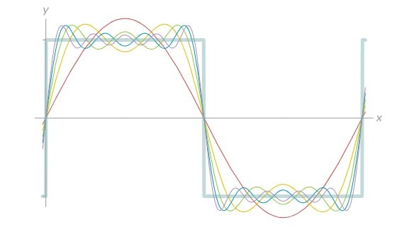 Преобразование Фурье выполняет это для всех возможных частот, умножая исходную функцию на синусоидальные и косинусоидальные волны. (На практике это сравнение выполняется на комплексной плоскости с использованием комбинации действительных и мнимых чисел.) Таким образом, преобразование Фурье позволяет разложить сложную на вид функцию всего на несколько чисел. Это сделало его важнейшим инструментом для математиков: если они не могут решить какую-то задачу, они могут попробовать преобразовать её. Часто задача становится намного проще, если перевести её на язык частот. Если исходная функция имеет резкий скачок, как в случае с прямоугольным сигналом ниже (который часто встречается в цифровых сигналах), преобразование Фурье даст бесконечный набор частот, которые, будучи сложенными вместе, максимально точно аппроксимируют скачок. Этот бесконечный набор называется рядом Фурье, и, несмотря на то, что математики поначалу не хотели признавать его существование, сейчас он является важным инструме