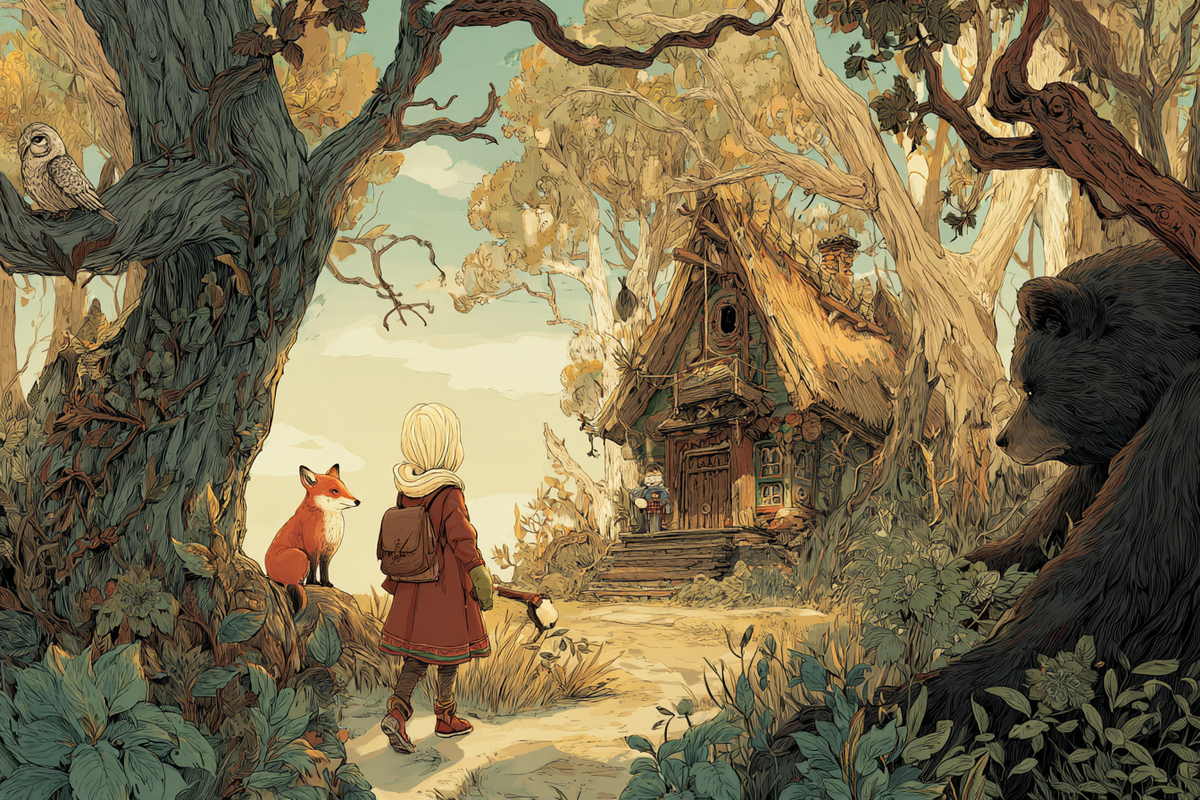 Долго ли коротко шла девочка, но чем глубже она заходила в лес, тем гуще он становился. Внезапно она увидела старый избушку на курьих ножках.