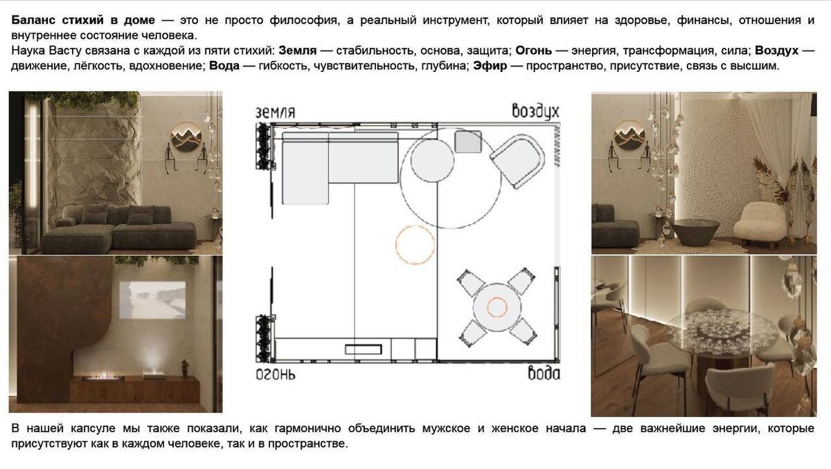Концепция капсулы 33 Гармония стихий , продолжение : Баланс стихий в доме — это не просто философия, а реальный инструмент, который влияет на здоровье, финансы, отношения и внутреннее состояние человека. Наука Васту связана с каждой из пяти стихий: Земля — стабильность, основа, защита; Огонь — энергия, трансформация, сила; Воздух — движение, лёгкость, вдохновение; Вода — гибкость, чувствительность, глубина; Эфир — пространство, присутствие, связь с высшим. В нашей капсуле мы также показали, как гармонично объединить мужское и женское начала — две важнейшие энергии, которые присутствуют как в каждом человеке, так и в пространстве. Мужская энергия — это структура, логика, концентрация и целенаправленность. Женская — это мягкость, принятие, чувствительность, интуиция. Наша задача — не противопоставлять их, а объединить в балансе, где каждая сторона находит поддержку и реализацию. Мы условно разделили пространство на две зоны — мужскую и женскую — чтобы наглядно показать, как через плани