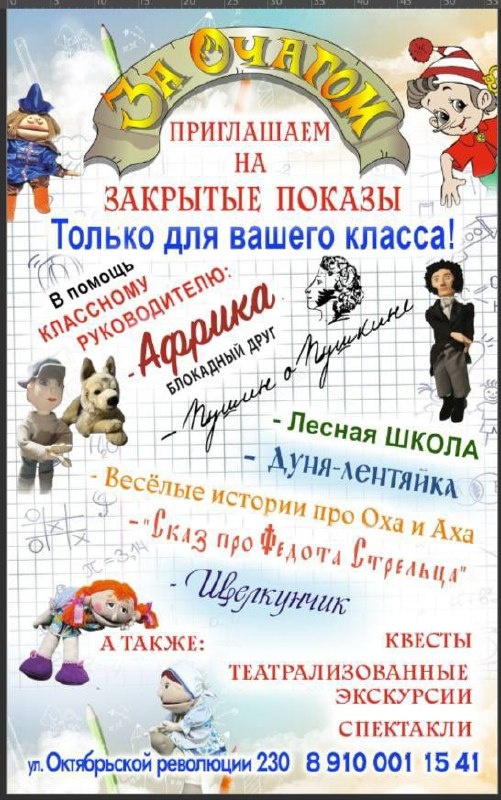 "За Очагом" - это волшебное сказочное место, которое когда-то нашел Буратино в каморке у папы Карло и пригласил жить туда всех своих знакомых кукол, а они уже пригласили своих. Так вырос большой и уютный дом, где живут свою настоящую интересную кукольную жизнь самые разные куклы. Здесь все как у людей: есть актеры и повара, танцоры и слесари, учителя и врачи, веселые животные, мамы и папы и даже малыши. И все они играют в театре, и приглашают людей на свои спектакли, квесты, театрализованные экскурсии, кружки, а также предлагают отметить дни рождения и другие праздники весело и незабываемо. Добро пожаловать в гости "За очагом", здесь вам очень рады! Часы работы: Ежедневно с 10:00 до 19:00 https://vk.com/za_ochagom