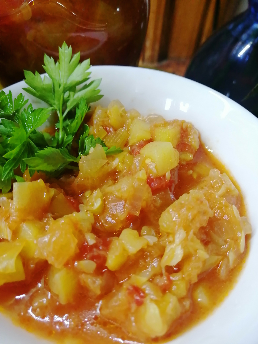 Друзья, я напишу свой примерный рецепт салата. Уже давно готовлю на глаз, но пропорции примерно такие. Кабачок - 1 кг, Помидоры - 500 грамм, Перец болгарский - 300 грамм, Лук репчатый - 200 грамм, Чеснок- несколько зубков, Сахар - 2 ст л, Соль - 1 ст л, Уксус - 2 ст л, Перец острый чили по вкусу. Лавровый лист, перец горошек, перец душистый. Раст масло-50 грамм. Овощи взвешиваю уже чишеные и подготовленные. Режу как Бог на душу положит. Когда кубиком, когда соломкой. Всё овощи стазу все закладываю в кастрюлю. Кабачок на дно, следом другие овощи. Перец болгарский. Лук репчатый перышком режу. Выставляю очень низкую температуру на плите. Закрываю крышкой и оставляю тушиться до мягкость, периодически перемешивая, что бы все овощи отдавали свой сок. Тут у меня фото с двух партий салата, потому что некоторые фото не получились. Память телефона уже переполнена фото. Тушу часа два. Помидоры надрезаю крест на крест и заливаю кипятком. Потом буду с них снимать кожицу. Т