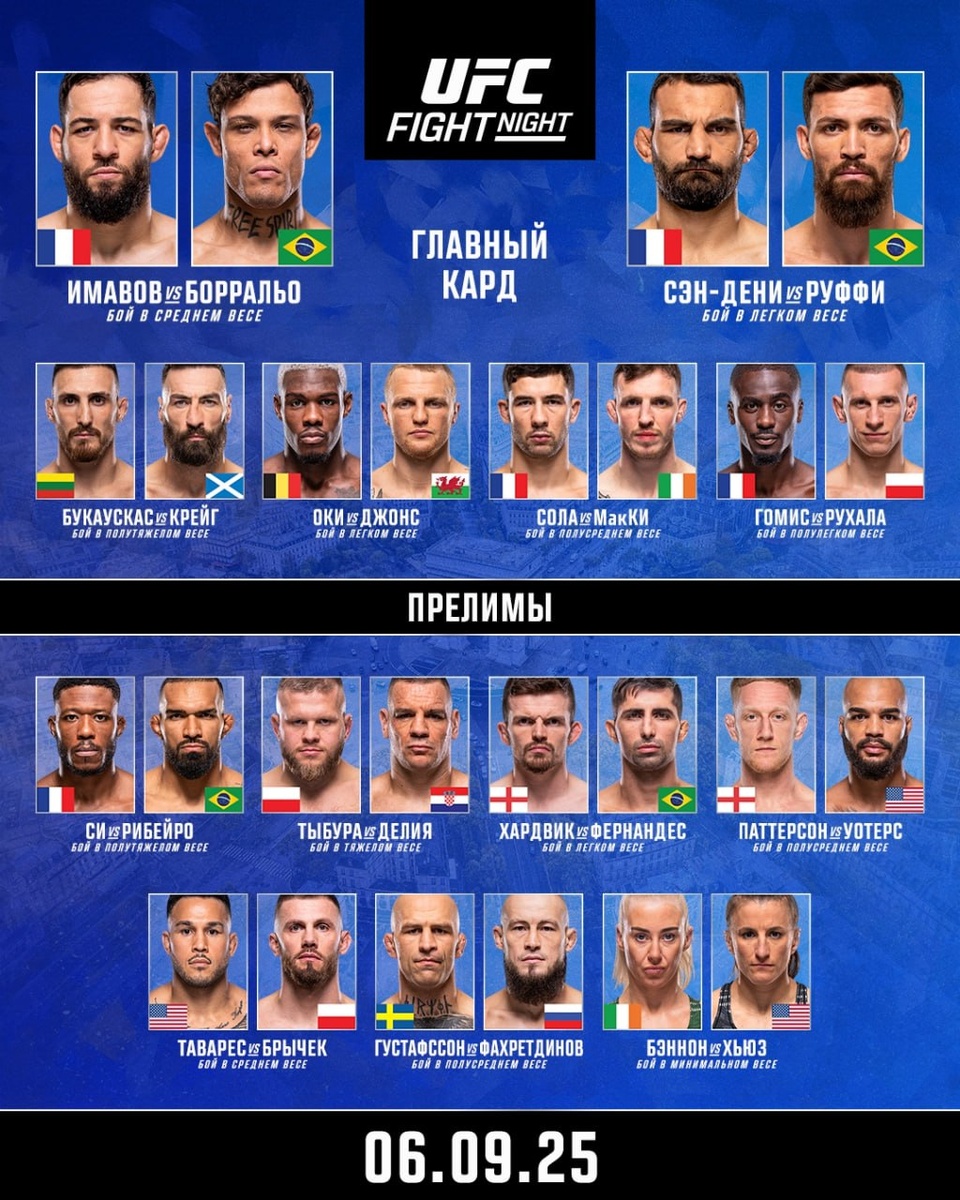 UFC Paris: Имавов vs Борральо Опять ЮФС порадует нас турниром в удобное время. Начало прелимов в 19 часов по московскому времени по подписке на UFC Fight Pass, Матч!Боец и видеосервисе SportBox. Поединки главного карда будут показаны абсолютно бесплатно в прямом эфире на телеканале МАТЧ ТВ - начало в 21 час (мск). Подпишись, чтобы не пропустить