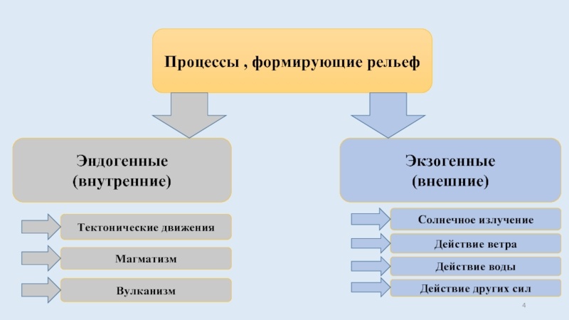 Эти факторы связаны с энергией, поступающей из недр Земли. Они создают крупные формы рельефа, такие как горы, равнины, океанические хребты и впадины.