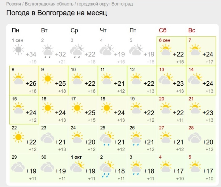 Сервис Gismeteo демонстрирует, что волгоградцев покинуло приятное летнее тепло. Комфортная отметка +26 тоже не торопиться удерживаться на столбиках термометра. Так, в понедельник 8 сентября, еще будет умеренно тепло – до +26 градусов днем и малооблачно. Во вторник выглянет солнце, но на столбиках термометров будет уже до +25. К среде температура резко снизится до +22, к четвергу до +21. Пятницу 12 сентября будем встречать с отметкой +22. И только к будущим выходным увидим отметки +23 - +24. Кстати, начиная со среды, нас ждет малооблачная погода, так что прогреваться воздух уже сможет лишь отчасти, ведь дело идет к глубокой осени. Более теплой с отметками +25 +24 прогнозируется большая часть предпоследней сентябрьской недели. Ну а в последнюю неделю месяца ждем +21 - +20, пасмурной погоды и дождей. Сервис «Яндекс. Погода» аналогично демонстрирует, что к середине новой недели столбики термометров в Волгограде резко упадут до +21. А вот ощущаться эта температура будет весьма некомфортно,