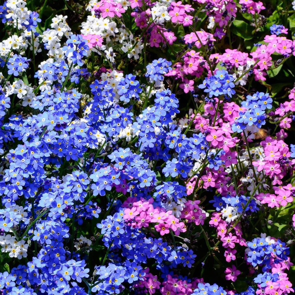 - Незабудка гибридная (Myosotis х hybrida) — самая популярная в садоводстве, радует разнообразием цветов: от небесно-голубого до розового и белого.